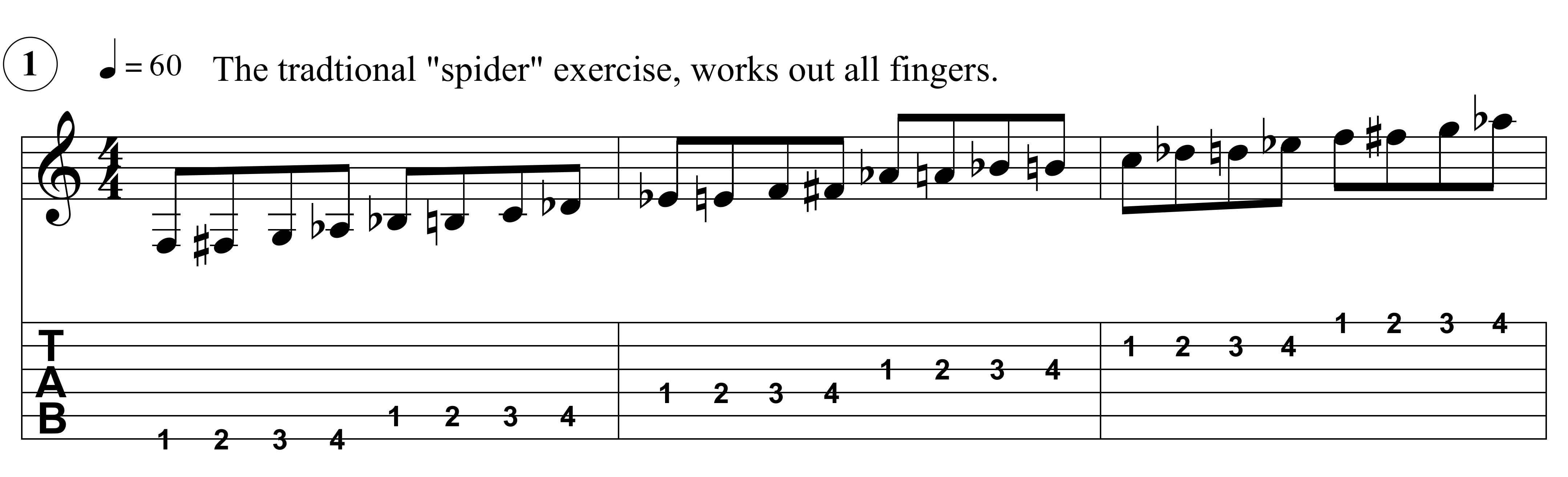 This is an exercise I learned early on in my lessons and there’s a lot you can do with it. It's often called the "spider" exercise. If you’re not familiar with it, it looks like this: