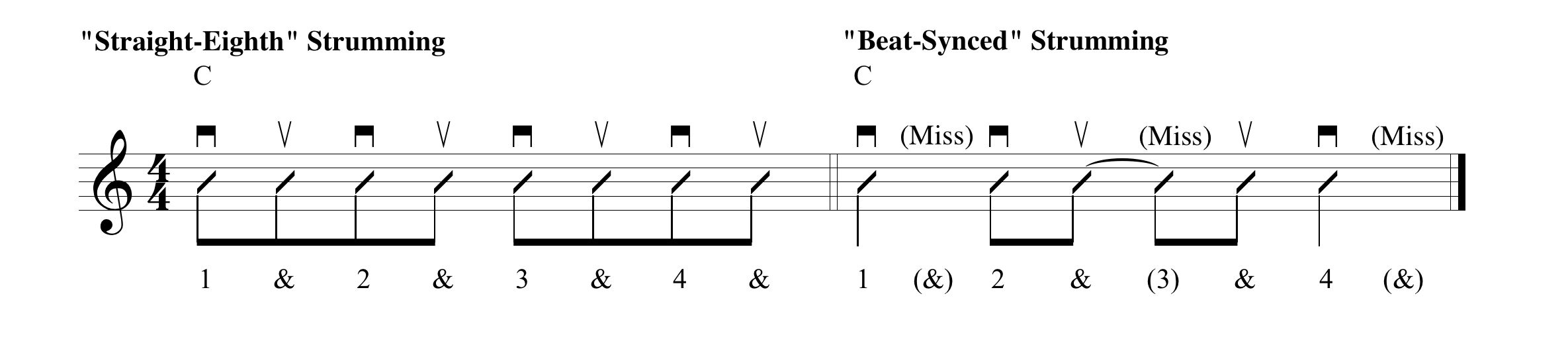 Think about how you learned to strum. Chances are, at some point, someone told you to keep your hand moving in a steady down-up motion. Downstrokes land on the beat. Upstrokes fill in the space between the beats. If you want a different rhythm, you don’t change the motion—you just miss the strings at certain moments.