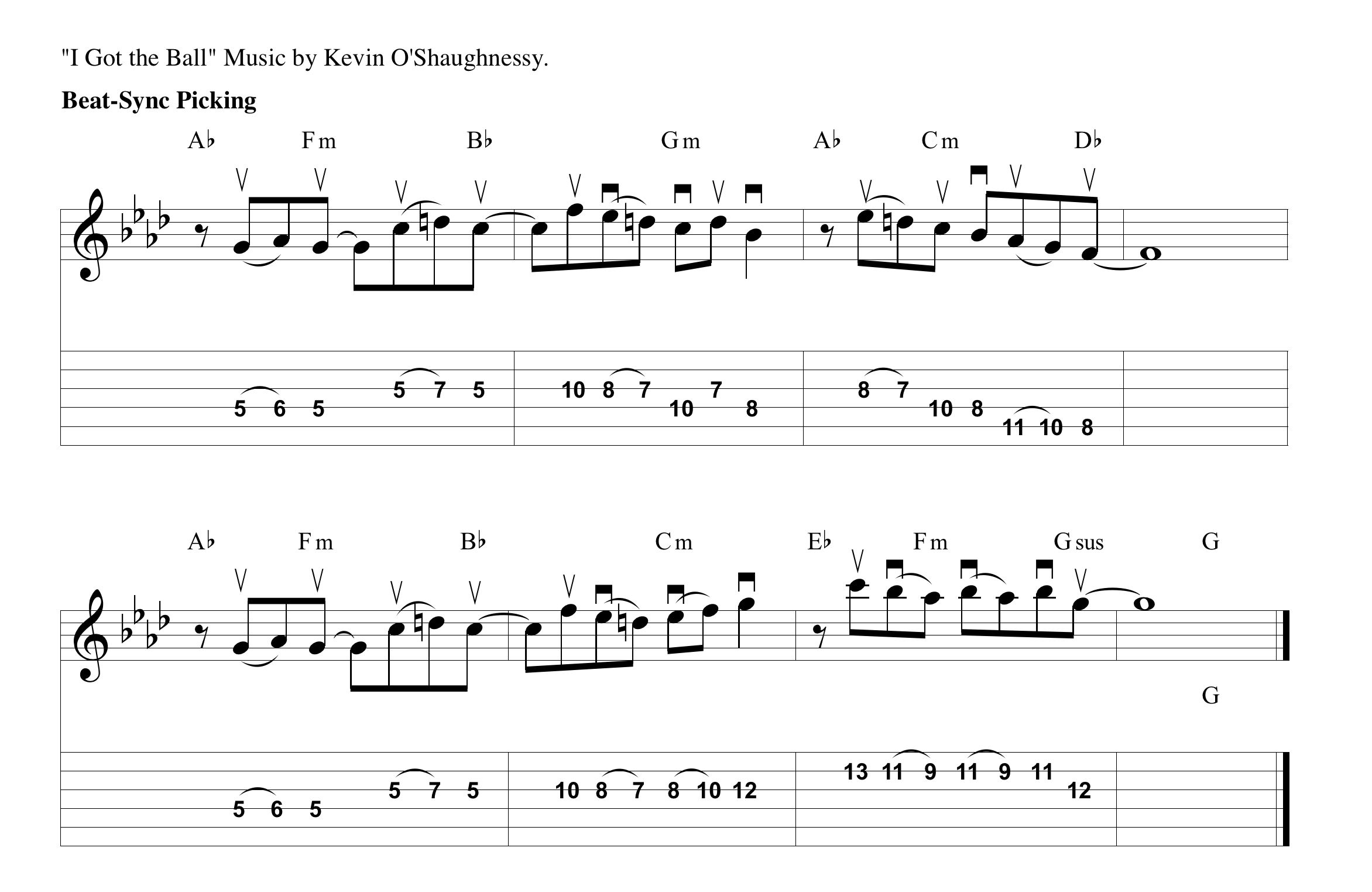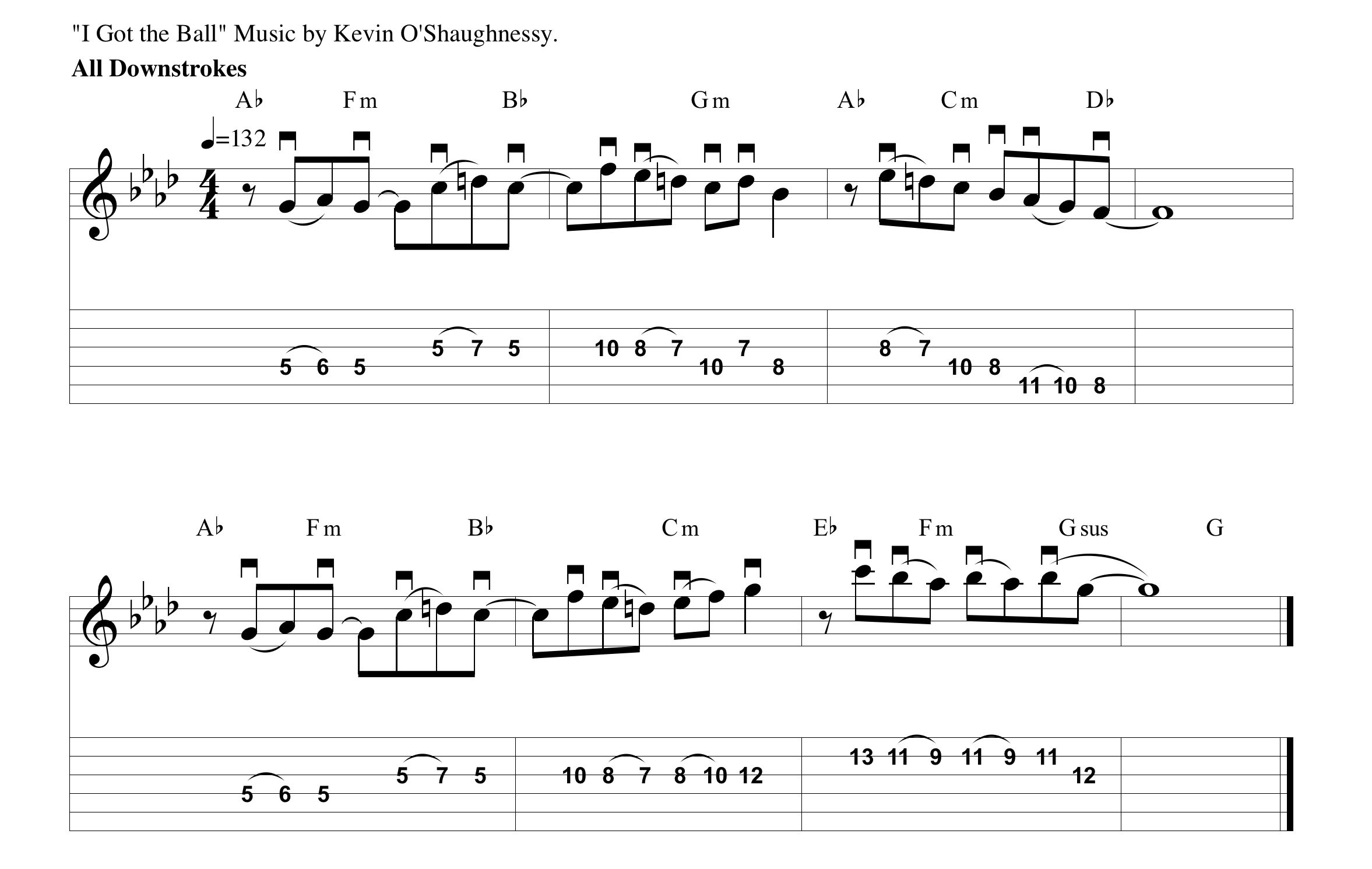 Take a look at this example from my song, “I Got the Ball”. The first version is written in all downstrokes, the second using what I call beat-synced alternate picking. The picking of the phrase is slow enough that either one is easy to play. But the second version allows me to switch to a strumming pattern or a shredding pattern with greater ease because I’m using the same technique for all three.