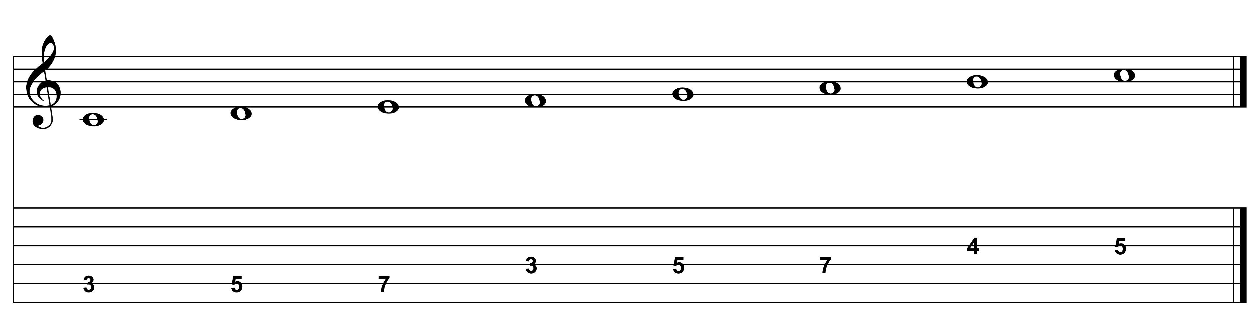 This orientation of the C Major scale is one octave lower, but notice how the notes line up--most of them are right on top of each other. And if you follow the same fingering as in the previous example, it's very easy to play.