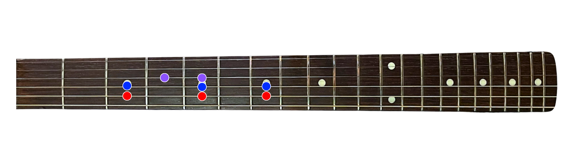 As you can see, this orientation lays out really well on the B string. If you want to practice the scale like this, I recommend using the color codes to tell you when to switch positions. Play the red notes first with fingers 1, 2, and 4, then switch to play the blue notes in the same way. The last two notes can be played with the first two fingers. Simply reverse the fingering for the descending version.
