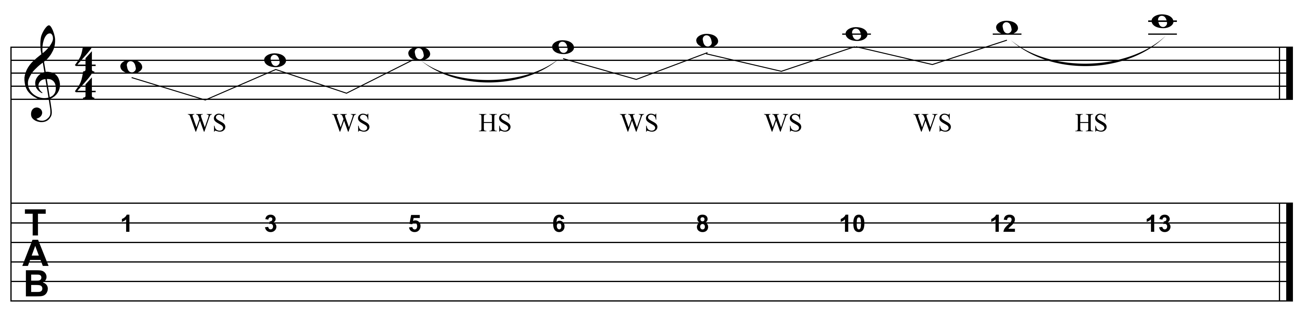 The Major Scale, has been the central structure of western music for centuries and is composed of five whole steps and two half steps. A half step is a distance of one fret, and a whole step is two frets.